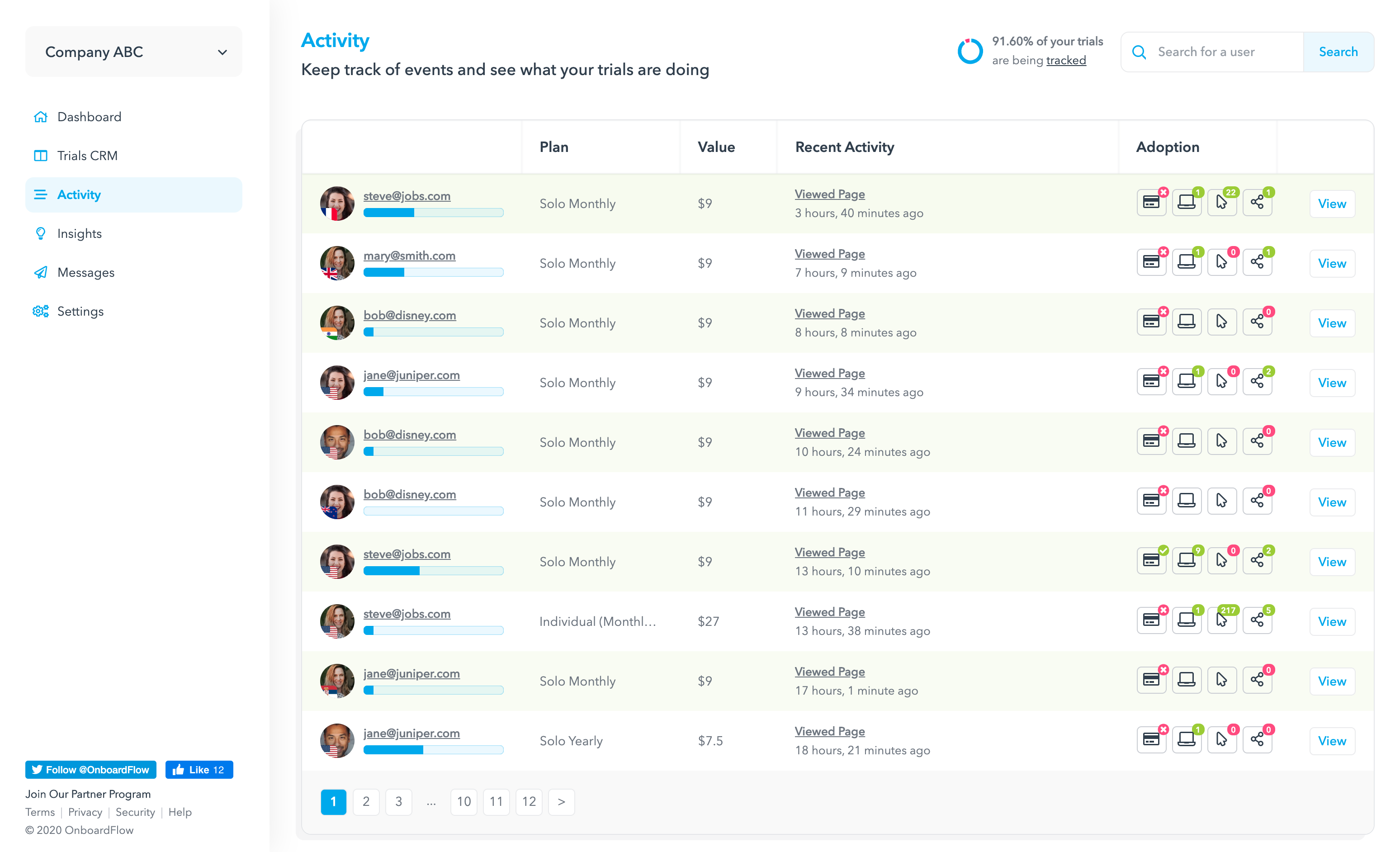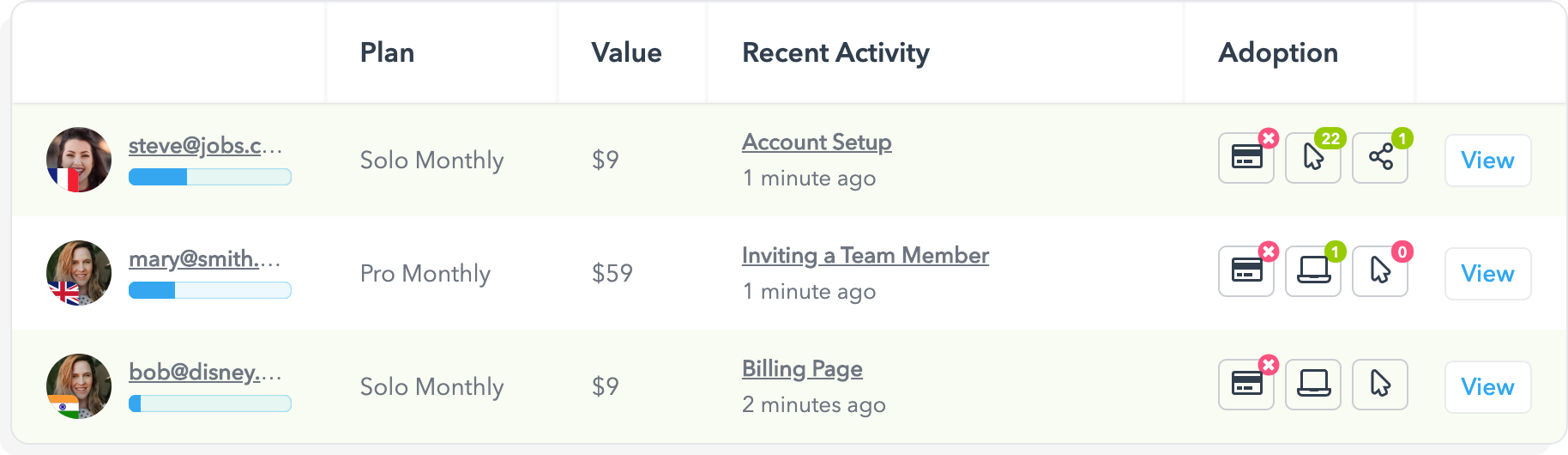 With OnboardFlow it's easy to see who's online and whether they are engaging with your product in the way you'd expect.